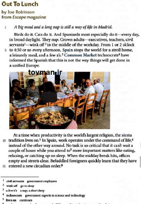 Birds do it. Cats do it. And Spaniards most especially do it-every day, in broad daylight. They nap. Grown adults-executives, teachers, civil servants۱-wink off۲ in the middle of the workday. From ۱ or ۲ o'clock to ۴:۳۰ or so every afternoon, Spain stops the world for a stroll home, a leisurely meal, and a few z's.۳ Common Market technocrats۴ have informed the Spanish that this is not the way things will get done in a unified Europe
